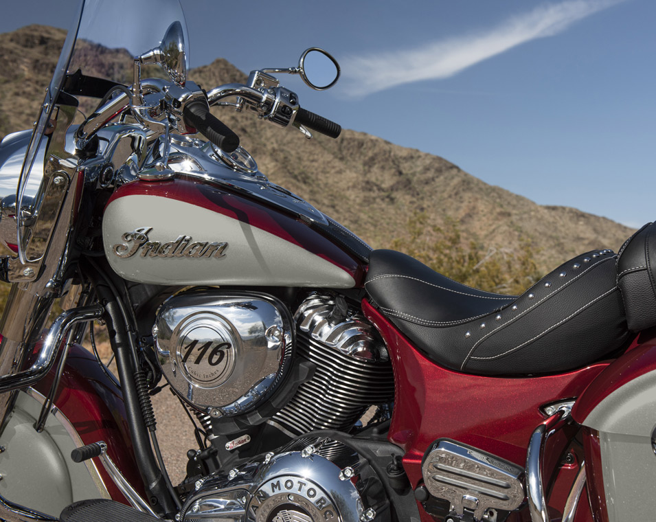 | 標準装備 | クイックリリース・ウインドシールド、リモートロック式ハードサドルバッグ、ハイウェイバー、ライドモード、ABS、クルーズコントロール、キーレスイグニッション、インディアン®スクリプトタンクバッジ、12V充電ポート |